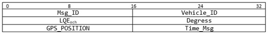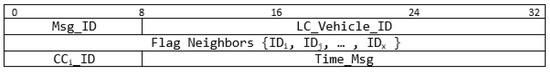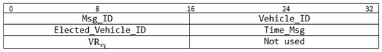 During a specified waiting time (Ϥ) period, each vehicle waits for the arrival of a new vehicle to register it in the neighbor’s list and recalculates. In the event that no vehicle registers a new neighboring vehicle during the period of wait time, a new election message “Elect Msg” will be broadcast by the vehicle in order to elect Ordinary Cluster. All neighbor vehicles of vehicle will receive the elect message, and even if their wait times have not expired the election starts. The frame format of “Elect Message” used in our approach is shown in Figure 5, which mainly includes as source information the message information. The source information includes the identifier Vehicle_ID of the source vehicle, Reliability (we call the vehicle that sends a message “source vehicle ”), and the identifier of elected vehicle Elected_Vehicle_ID. The message information includes the identifier Msg_ID and timestamp of message Time_Msg. Algorithm 1 shows how vehicles perform to form an ordinary cluster.