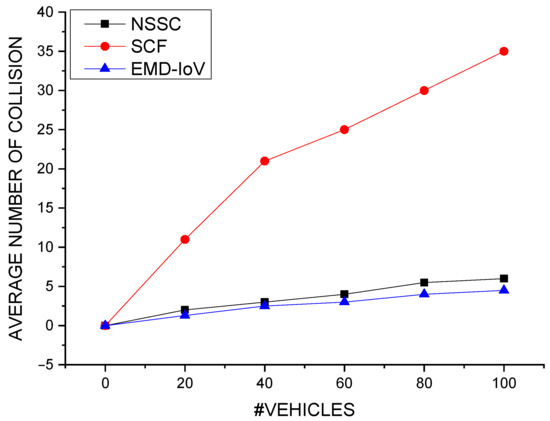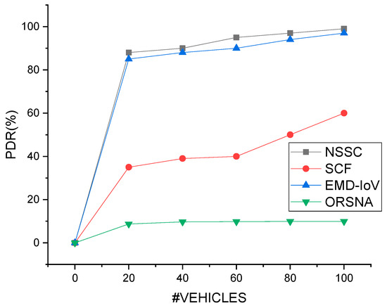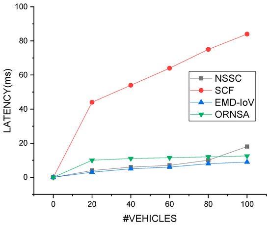 Figure 14 shows the latency of EMD-IoV as compared to NSSC, SCF, and ORSNA schemes, while varying vehicle density. As we observe, our scheme minimized the latency transmission even when we increased vehicle density, as compared to the other schemes. This is mainly due to our clustering scheme that allows selection of the best routing route, and reduces the number of forwarder vehicles before reaching the destination node. However, the SCF scheme is based on a store and forward principle. The latter enables vehicles to store data in their memories. Once a new vehicle is in the vicinity, the stored data will be sent to this new vehicle. This causes an increase in the latency transmission, especially in sparse density conditions, compared to the other schemes. Similarly, even the ORSNA determines the optimal relay node with two interactions, reducing retransmission due to collision. This causes an increase in the latency transmission. Similarly, even the NSSC and ORNSA are based on clustering schemes, and the authors have used optimization algorithms such as chaotic crow Search to elect the CHs, which may introduce more computing complexity and hence also increase latency delays. Therefore, the increasing latency of SCF, NSSC, and ORNSA is mainly due to the lack of optimal path in broadcasting safety messages.