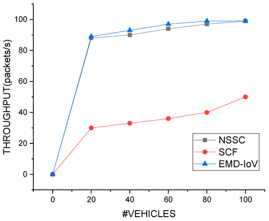 Figure 17 shows the generated vehicles’ throughput in the three schemes, while varying vehicles density. We clearly see that vehicles’ throughput in our EMD-IoV scheme is higher than the other schemes, thanks to our stable clustering architecture that is based on the link stability metric and optimal selection of LCHs and OCHs. Moreover, the SCF scheme has low vehicle throughput since all vehicles participated in data dissemination, which decreases the global throughput of vehicles.