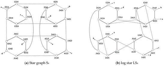In this section, we provide the definitions used in this paper, and we define the log star LSn. The node address of LSn uses a permutation of the natural numbers from 1 to n. Let an arbitrary node be S = S1S2S3 … Sk−1SkSk+1 … S2k−1S2kS2k+1 … Sn−2Sn−1Sn. In Definition 2, the symbols s1 and Sk are exchanged with each other, and in Definition 3, multiple symbols are exchanged.