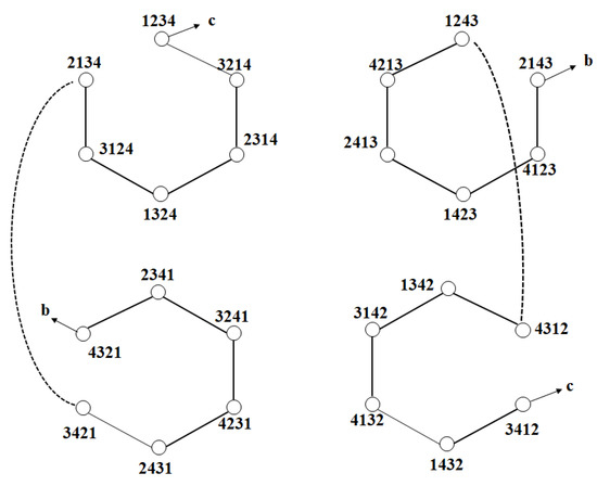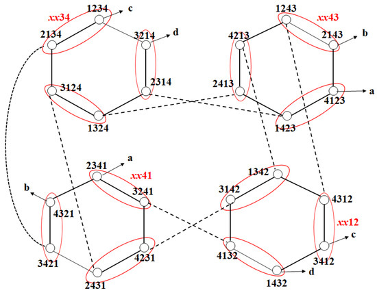 The number of nodes in LS4 is 4!. LS4 comprises 12 (=4!/2!) LS2. The number of nodes in LS2 is 2!. Figure 2 shows the subgraphs xx12, xx13, xx14, xx23, xx24, xx21, xx34, xx31, xx32, xx41, xx42, and xx43. x refers to an arbitrary number.