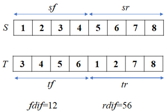 In Figure 5, for example, suppose S = 12345678 and T = 34561278. Then sf = {1, 2, 3, 4}, tf = {3, 4, 5, 6}, sr = {5, 6, 7, 8}, and tr = {1, 2, 7, 8}. In this case, fdif = {1, 2}, rdif = {5, 6}, |fdif| = |rdif| = 2, rdif[1] = 5, and rdif[2] = 6.