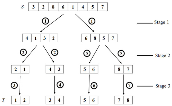 We provide an example to clarify the routing process. This explanation should be read with reference to Figure 6 and the routing algorithm. In LS8, let S = 32861457 and T = 12345678. fdif = {sf} − {tf} = {8, 6}, and rdif = {sr} − {tr} = {1, 4}. |fdif| = |rdif| = 2. Because |fdif| is not greater than 2 (= n/4), swap ① in the routing algorithm is skipped. In separation(), symbols 8 and 6 in sf and symbols 1 and 4 in sr are exchanged with each other. Figure 6 shows the stages in which the separation() is executed. In stage 1, sf = {4, 1, 3, 2}, and sr = {6, 8, 5, 7}. In stage 2, the same operation is repeated at sf and sr. Thus, S = sf = {4, 1, 3, 2} and T = tf = {1, 2, 3, 4}, and 4 in sf and 2 in sr are exchanged. As a result, sf = {2, 1} and sr = {4, 3}. In the next stage, the results are sf = {1, 2} and sr = {3, 4}. The operations are the same in the remaining part. If the skipped part is included, the entire routing path is as follows: