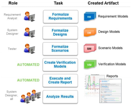 Virtual verification of designs against requirements (vVDR) is a method that enables model-based system design verification against requirements. The vVDR methodology has been validated on a number of industrial use-cases [,]. Figure 1 shows the basic steps of the vVDR method and the artifacts created.
