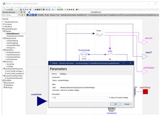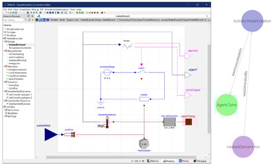 Several studies (e.g., [,,,,]) report that diverse heterogeneous artifacts and tools in the development life cycle are a challenge to be faced when establishing traceability links. From the studies, one of the solutions for this challenge is tool integration where all existing tools are connected so that it becomes possible to exchange information about the heterogeneous artifacts and create traceability links between them. This was achieved for CPS development in our previous work [], in which some of the components of the traceability framework were developed. What is currently missing is an integrated tool platform to establish, maintain, and use the traceability links of heterogeneous artifacts and activities (e.g., requirements, design models, scenario models, simulation results, validation, and verification) in the development life cycle. The open-source environment OpenModelica (see also: https://www.openmodelica.org accessed on 31 March 2021) [] has the potential to contribute to such a platform because it already supports all of the activities in the development life cycle. This work integrates the previously developed traceability components with new ones into an integrated system inside the OpenModelica tool. OpenModelica is an integrated open-source environment for modeling, simulation, optimization, model-based development, and analysis of large-scale CPSs. The environment is based on the equation-based object-oriented Modelica modeling language standard [,] and the Functional Mockup Interface (FMI) standard [,] for model exchange and co-simulation.