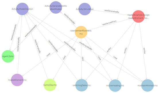 - Activities—An activity is something that occurs over a period of time and acts upon or together with entities. It may include using, processing, transforming, modifying, or generating entities. In our work, activities include creating and modifying models, simulations, verifications, and reports.