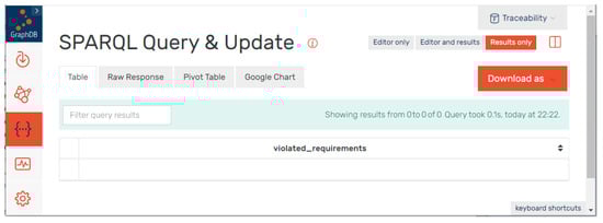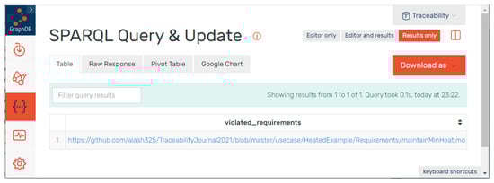 In this research work, hyperlinks, lists, and graph visualization techniques were realized by integrating the built-in GraphDB interface into our framework. In the hyperlinks view, traceability links are displayed as hyperlinks from an artifact and can be clicked to navigate to the linked artifacts. The graph-based visualization approach represents different entities (artifacts, agents, and activities) as nodes and the links as edges in a graph. Also, different types of entities are identified using specific colors. However, in the case of large amounts of data, it is less intuitive to display relationships. To make it more intuitive, the tool allows for the querying of the traceability data, which filters the set of relationships to be displayed.
