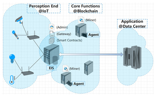 The core functions of a blockchain on the edge nodes: Several kinds of edge nodes are set up in order to balance efficiency and complexity. Ordinary nodes are only used as the sensor interface or connectivity to maintain IoT integrity. Special agent nodes perform special tasks, such as protocol conversion, a gateway between IoT and blockchain, and miner and query in blockchain. Manager nodes served by an Edge Intelligent Server (EIS) have strong computing and storage capabilities and integrate hardware and software to build various edge-cloud services, such as Supervisory Control And Data Acquisition (SCADA), security management, Human–Machine Interaction (HMI) for the cloud, edge application development, support for I/O and sensor compatibility and IoT protocol connectivity, intelligent data processing and management for the edge.