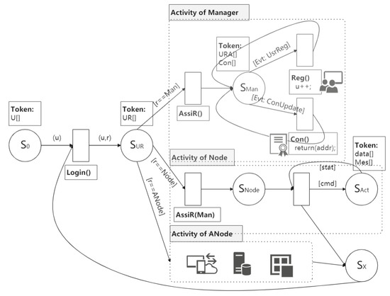 Figure 3, namely Activity of Management (AM), Activity of Node (AN), and Activity of AgentNode (AAN), where AAN contains three basic services: Service of Blockchain Miner (SBM), Service of IoT (SIoT), and Service of Cloud (SCloud). After logging in, users will participate in the following activities according to their respective roles: