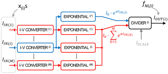 To realize a full N-sized softmax array, the implementation of N analytical models such as the one shown in Equation (11) and then of N schematics such as the one sketched in Figure 2 is required, one for each input. However, from a circuital point of view, although the exponential stage and the analog divider must be replicated to produce each independent output, the input current–voltage stages can be shared among different outputs.