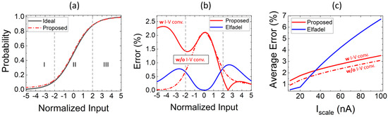 The vertical difference between the circuit transfer characteristics and the theoretical function, normalized to the theoretical value (i.e., the relative error), is shown in Figure 4b. Here, we report the transfer-function error of the full softmax circuit, as well as the one extracted without considering the current-to-voltage converter, i.e., isolating the “intrinsic” softmax with only exponential and divider blocks. The circuit proposed in [15] was also simulated with the same 180 nm TSMC technology models, enabling a fair comparison. Transistor sizing and input scale were independently optimized for each proposal, while the nominal ISCALE = 10 nA is the same. Our intrinsic softmax proposal features a bell-shaped error, with a peak error in the central part of 2.2%, which can be ascribed to an input offset. On the other hand, the error in topology proposed in [15] shows two peaks for an input close to −2.5 and 2.5 (of 0.8% and 1%, respectively). In addition, if we consider the impact of the current-to-voltage converter, there is an additional error contribution in regions I and III. This is ascribed to the upper and lower bounds of the conversion circuit given in Equation (6): only the one in III can be compensated by appropriate trimming of the ISCALE (already done in the figure). However, an error lower than 2.2% in the whole range is observed with an average value of ~1.4% in the investigated operating range (the corresponding value when the input current–voltage converter is not considered is <1%).