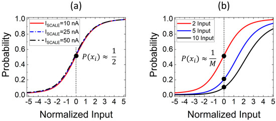 In Figure 5a, the softmax transfer function simulated for an ISCALE of 10, 25 and 50 nA (with M = 2) is shown. Given that we are considering only two inputs, the softmax probability for each of them corresponds to 50% when their value is the same (i.e., zero in this example). In Figure 5b, a similar plot as in (a) is shown but for a fixed ISCALE of 10 nA and for M = 2, 5 and 10. Even in this case, only one input is swept, while all the other inputs are kept constant to 0. The softmax probability corresponds to 1/M when the values of all inputs are the same.