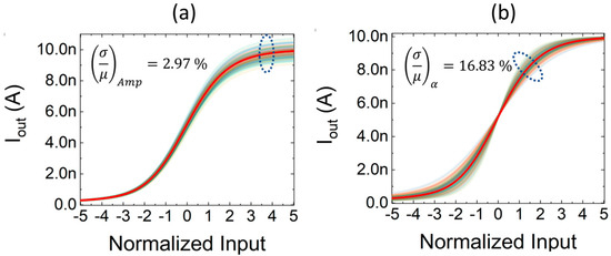 With regard to mismatch and process variations, the circuit behavior is shown in Figure 7, where transfer characteristics were computed for 100 statistical Monte Carlo runs. In this case, only the input scale is normalized, while on the y-axis, output currents are represented (with no normalization) to highlight the effects of variability on the amplitude. The impact of mismatch variations in Figure 7a is mainly related to the deviation of the characteristic amplitude, considering that the transfer characteristics exhibit a standard deviation of the maximum output current variation of 2.97% with respect to the mean value. On the other hand, process variations in Figure 7b behavior mainly result in a variation of the slope. In particular, the curves feature a ratio of the slope standard deviation to the slope average value of 16.83%, with a negligible variation of the amplitude. It is important to remark that amplitude and slope parameters are both adjustable in our proposal, meaning that any variation can be properly compensated through calibration, while this is not an option for other analog proposals.