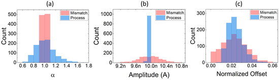 To provide additional details, in Figure 8, softmax transfer-characteristic parameters such as the slope (a), the amplitude (b), and the offset (c) are extracted for 1000 Monte Carlo runs, for both mismatch and process variability simulations. A small variation of offset (normalized to the input scale) is observed, although it is a second-order effect with respect to variations in slope and amplitude.