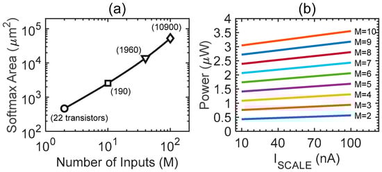 (a) Area overhead as a function of the number of inputs and outputs (M) of the softmax assuming an implementation in a 180 nm CMOS technology node. The needed number of transistors is also reported for some conditions. (b) Power consumption as a function of ISCALE for different number of inputs. VDD = 500 mV.