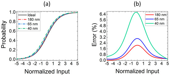 Finally, Figure 10 shows the transfer characteristics (a) and related errors (b) of a softmax function simulated with three different technology nodes, namely TSMC 180 nm, 65 nm, and 40 nm, in order to investigate the impact of technology scaling. The basic shape of the softmax function is preserved also for the smallest technology option, especially in the linear region. However, due to an increased offset as a result of ISCALE being adjusted to match the upper part, a worsened matching in the linear region can be observed, resulting in a higher relative error, with a peak value close to 6.5%, which can be still reasonable since there are simple DNNs which can operate with a reduced equivalent number of bits [3].