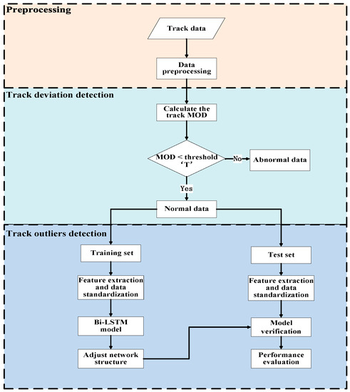 The aircraft track anomaly includes the track deviation and the track outliers. A track deviation means the flight of the aircraft deviates from the fixed flight route. The track outliers refers to the abnormal height, speed and heading of aircraft at some track points. The flowchart of the algorithm for track anomaly detection based on MOD-Bi-LSTM is shown in Figure 1.