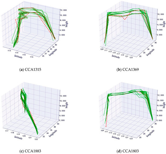 The MOD algorithm can be used to preprocess the track data and detect the track deviation from the route in the data. Take longitude, latitude and height for example, Figure 4 shows the track deviation detection result based on MOD, in which the red dotted line indicates the track deviated from the route and the green solid line indicates the normal track. Figure 4a–d respectively show the flight track of flights CCA1315, CCA1369, CCA1883 and CCA1803 within a month. According to the detection results, the tracks that obviously deviate from the fixed flight route are removed from the data set.