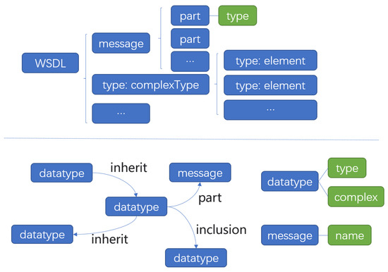 The message and type elements expressed in Web Services Description Language (WSDL) are located at the top. The corresponding message, datatype and relationship defined between them in service knowledge graph are located below. The green box indicates that the content is an attribute, and the blue indicates element (in WSDL) or ontology (in service knowledge graph).
