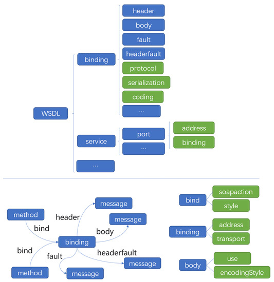 The binding and service elements expressed in WSDL are located at the top. The binding and relationship defined between binding and other ontology in service knowledge graph are shown below. The green box indicates that the content is an attribute, and the blue indicates element (in WSDL) or ontology (in service knowledge graph).