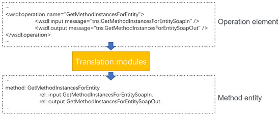 When constructing a large-scale service knowledge graph based on the ontologies, we use the WSDL document data set provided by Zhang et al. [1] and the information of WSDL document is stored by the instantiation of the corresponding service ontology. We built a translation module to convert the WSDL document into information described by RDF, and store the information in the format of Turtle. When some information in the WSDL is empty, the instantiation of the information in the graph does not exist or the value of the attribute storing the information is empty. It depends on the form of information expression. As the information that does not originally belong to the same namespace will eventually be aggregated, in the construction of the knowledge graph, each service ontology has id and namespace attributes in addition to the relationships and attributes introduced earlier to ensure that there will be no conflicts in namespace when a large number of WSDL documents are automatically converted. The system finally converted the WSDL documents, and constructed a knowledge graph that contains 3738 service entities. An example of instantiation of a method ontology and the corresponding part of the WSDL document are shown in Figure 4. The construction method of the knowledge graph is shown in Figure 5.