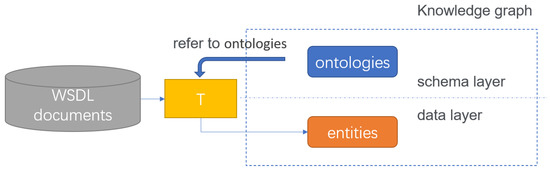 The method of constructing knowledge graph. T represents a series of translation modules. Designed ontologies form the schema layer of the knowledge graph. The translation module designed with reference to the ontologies converts WSDL documents into service entities and stores them in the knowledge graph.