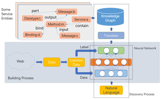 In the previous section, we can draw a conclusion that we can use a knowledge graph to store all kinds of web service information without omission, and sort out the service information more intuitively in the knowledge graph by defining ontology and relationship. However, the advantages of creating a service knowledge graph are not only that but also more convenient to store additional information by using a knowledge graph than using a WSDL file. We can store additional information in the service knowledge graph, which cannot be stored in the WSDL document. This information contains semantics, such as the relationship between service entities, the category of the service, and so on. Integrate this kind of information on the knowledge graph and use this information in downstream tasks. This process is called the semantic relationship expansion of the service knowledge graph. The process is shown in the Figure 6. The process of semantic relationship expansion is divided into two parts, building process and discovery process. In the building process, we need to determine the semantic information that need to be integrated into the knowledge graph and clarify the manifestation of this kind of information in the knowledge graph, and then store the information of each service entity. After that, we use various corpora on the network to label the data set about the semantics and train the neural network. In the discovery process, we input the natural language used in the search into the neural network, and the network obtains the output. Then use the query language conversion module set according to the semantic information to convert the network output into the corresponding graph query language, search in the knowledge graph, and finally realize the service discovery on the service knowledge graph using natural language. Under the guidance of this methodology, we conducted two experiments to expand the semantics of the service knowledge graph in two aspects.