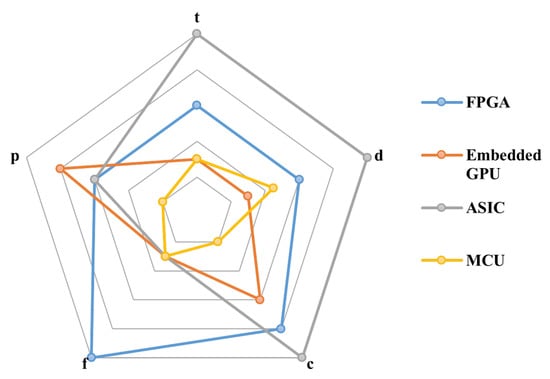 After discussing all these resource-limited platforms and barriers in acceleration, we are going to illustrate why we prefer FPGA as acceleration platform. Five aspects are taken into account including—development time (t), development difficulty (d), cost (c), flexibility (f), throughput (p). In fact, these indicators vary in different designs even they are in the same hardware, not to mention that ASIC platforms are actually different hardware chips each. Our comparison relies on our research which could be imperfect and reaches compromise, qualitative standards among diverse designs.