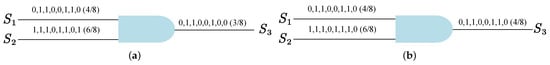 Stochastic computing (SC) is a very unique algorithm that represents and processes information in the form of digitized probabilities [44]. It has low computational complexity but needs long computation times and shows low accuracy. Figure 7 shows a demonstration of SC. The data in SC are coded as the probabilities of observing a 1 at a bit-stream with a given length. The output of the AND gate is the product of two probabilities if two bit-streams are suitably uncorrelated or independent. So, improvement of the accuracy of a stochastic computation requires an exponential increase in the bit-stream length as well as the computation time. A high degree of error tolerance is another feature of SC, especially for transient or soft errors caused by process variations or cosmic radiation [44]. Changing a single bit of output, as shown in Figure 7b, the result would not change greatly because each bit of the output in SC enjoys the same weight.