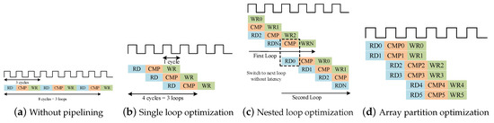 Comparison of processing with and without pipeline [59]. Pipeline can increase the efficiency and speed of the computing process, especially there are sparse hardware resources. According to the application situation, the method can be divided into three categories: single loop optimization, nested loop optimization, and array partition optimization. These techniques can be combined.