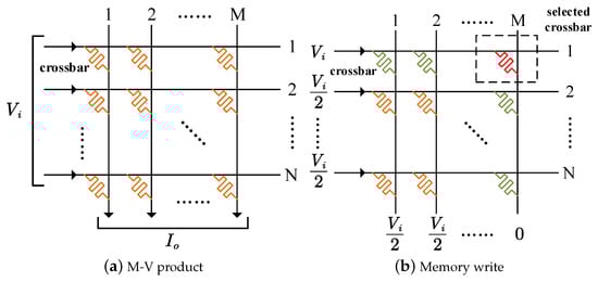 RRAM becomes a promising solution in the implementation of CNNs on embedded platforms because of its capacity for calculating the matrix-vector product with high precision [63], high parallelism and the characteristic of energy efficiency. RRAM devices are able to support a large number of signal connections within a small footprint by taking advantage of the ultra-integration density [64]. RRAM can realize a resistive cross-point structure called the crossbar. The RRAM crossbar can store weights as conductance values of cells, and feature maps are converted into input voltage signals. The output feature maps can be read out through the accumulated currents on the bitlines. Figure 10 shows the basic structure of the RRAM crossbar and the operations on it, which are elementary units in the computing process. The crossbar and operations on it are independent. times M-V products which replace multiplications can be performed concurrently and intermediate results are the accumulated currents on the bitlines. RRAM offer concurrent computing ability based on its circuit configuration while methods we proposed above center on program structure. Namely, they are orthogonal because those methods are software design, but RRAM is an excellent hardware module for realizing them. FPGA and RRAM are also compatible.
