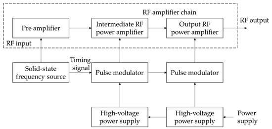 The task of the radar transmitter is to provide a high-power transmitting signal for the radar system to meet specific requirements, which is radiated to space by antenna through feeder and transceiver switch. The radar transmitter is mainly divided into two types: single-stage oscillation transmitter and master oscillation power amplification (M.O.P.A.) transmitter. Among them, the composition of the single-stage oscillatory transmitter is relatively simple and the cost is relatively low, but the performance is poor, especially the frequency stability is low, and it does not have phase-coherent characteristic. The composition of the M.O.P.A. transmitter is relatively complex, but it has good performance: it has high frequency stability, can generate complex signal waveform, transmit phase-coherent signal, realize the pulse compression mode and is suitable for broadband frequency agility, etc. [,,]. So far, most radars, especially instrumentation control radars and phased array radars with high stability and high performance, have adopted the M.O.P.A. transmitter. Therefore, this study mainly discusses the M.O.P.A. transmitter.