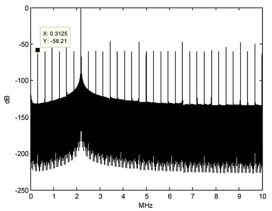 Here , . It can be calculated that the frequency value of the output signal , and the corresponding quantization spurious is . The simulation results are shown in Figure 11. It can be seen that the position and distribution of stray components are consistent with the theory.