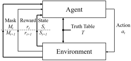 A proposed GateRL system is based on the RL methodology that consists of agent and environment, as shown in Figure 1. While the agent sends an action () to the environment to add a new connection to the schematic, the environment updates state (), reward (), and mask () and transfers them to the agent again. Unlike general RL networks, the GateRL makes use of the action masking scheme to take into account several constraints in the circuit design, as well as to reduce the size of the action space [27]. The target logic gate is specified by the truth table (T), where corresponding outputs are described over all the combinations of inputs.