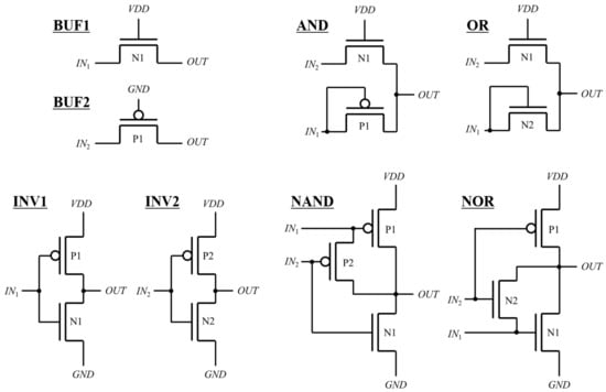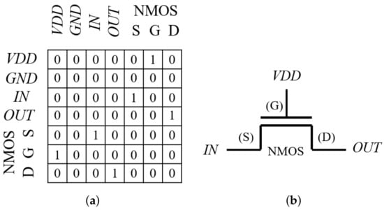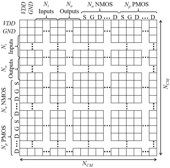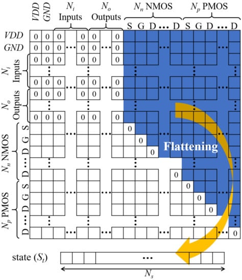 is extracted from the connection matrix (CM) that is similar to an adjacency matrix of a graph theory [28]. As depicted in Figure 2, all possible nodes of the schematic are equally assigned to columns and rows of CM, leading to the shape of a square matrix. , , , and are the numbers of inputs, outputs, n-type MOS (NMOS) transistors, and p-type MOS (PMOS) transistors, respectively. Therefore, the total number of columns or rows () can be obtained by Equation (1). The first two columns and two rows represent connections to supply voltage sources of VDD and GND. In particular, because transistors have three terminals of source (S), gate (G), and drain (D), the numbers of their nodes are calculated by means of the product of the number of transistors and the factor of 3. The connections of their body terminals are omitted by assuming that bodies of all NMOS and PMOS transistors are fixed at GND and VDD, respectively. From here, the node assigned to the i-th row or column is addressed as the node i ().