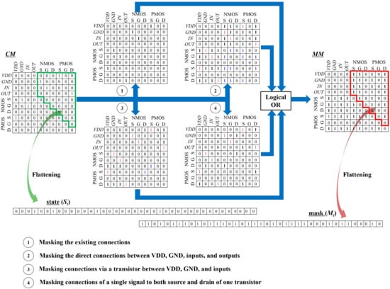 In the first place, a masking matrix (MM) is generated with respect to the current CM. MM is also the square matrix of where each element () of 0 or 1 represents whether that connection is available or not, respectively as described in Equation (5). Four masking criteria are reflected on MM as follows. First, since it is not necessary to repeat existing connections, corresponding elements of MM are set to be 1. Second, all direct connections between VDD, GND, inputs, and outputs are blocked. When a node is connected to one of VDD, GND, inputs, and outputs, that node must not be connected to any others of them. Therefore, elements of those short connections are also marked as 1 in MM. Third, when one of source and drain terminals is connected to VDD or GND or inputs, the other terminal of the same transistor must avoid the connection to VDD, GND, and inputs that brings about the drastic shoot-through currents between voltage sources via the transistor turned on. Fourth, it is forbidden to connect a single signal to both source and drain of a transistor. When one of source and drain is connected to a signal, its other terminal should not be assigned to the same signal.