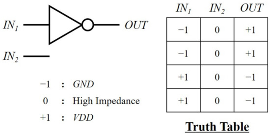 Truth table for an inverter circuit. Because it is an one-input gate, is kept at high impedance by assigning 0, where +1 is VDD, and −1 is GND.