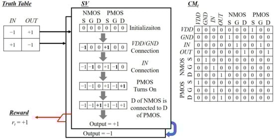 Since the proposed GateRL simply defines as +1 for the correctly working schematic and −1 for others, it is expected that the GateRL proposes the working schematics with the minimum number of connection steps, that is, the minimum number of transistors. Therefore, it is of the most importance to verify whether the schematic represented by CM meets a given truth table or not. For example, the truth table of an inverter regarding CM of and consists of four rows that include combinations of two inputs (, ) and their target outputs () as illustrated in Figure 6. Even though the inverter has only two cases of −1 and +1 for , the four-row truth table is composed for the agent to be able to support other two-input logic gates, such as AND, NAND, OR, and NOR, with a common GateRL framework. The high level of VDD and the low level of GND are described as +1 and −1, respectively. 0 indicates the high impedance that is equivalent to a floating node without any connections. The second column filled with 0 describes that the second input () is not in use for this one-input logic gate.