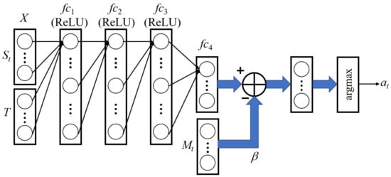 The agent is implemented by a deep Q-network (DQN) [29] that is composed of 4 fully connected networks (, , , ). It takes the concatenation of and T as the input layer (X) as presented in Figure 8. T is the flattened vector of a given truth table. The range of the values is changed into from −1 to +1 to become equivalent to that of T. Activation functions are rectified linear units (ReLUs) for , , and , and a linear unit for . In particular, the multiplication of a mask and a large scalar () is subtracted from the output layer of , guaranteeing that positions corresponding to mask elements of 1 are not available for the action selection. is decided by selecting the position of the maximum output through an argmax function with respect to actions. The overall network operations are described in Equations (6)–(11). , , , and are weight matrices, and , , , and are biases.