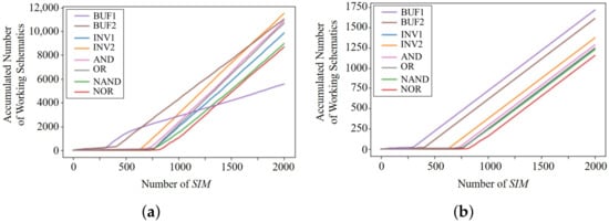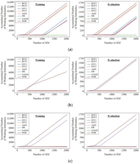 The numbers of extracted working schematics are plotted in Figure 10a,b for training and evaluation. An x-axis is indicated by the number of s where one is equal to 64 episodes. As expected, BUF1 and BUF2 begin to be extracted first, and then more complicated logics are obtained in the order of AND, OR, INV1, INV2, NAND, and NOR. Especially, because the counted values for BUF1 and BUF2 are much larger than others, their probabilities of the target logic selection are reduced in the training period, which is represented as their smaller slopes in Figure 10a.