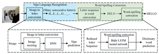 Figure 1 shows a block diagram of the process performed by the here presented American Sign Language alphabet translator (ASLAT). It mainly consists of three processing stages. The first stage is an image to letter conversion, which performs the sign language recognition task, this stage contains an image resizer and an object detection DNN, whose input is the image streaming from the camera, and the output consists of a time-series of letters that are the predictions of the DNN. The second stage is a letter sequence to word conversion that removes all equal consecutive predictions (e.g., RREEEDD is converted into RED). The third data processing stage is a word-spelling correction module, consisting of a bidirectional LSTM neural network, whose input is the reduced letter sequence, and the output is the predicted translated word of its dictionary. In our work, this correction feature is designed to compensate for accuracy lost in the ASL alphabet translator. Nevertheless, it can be used to enhance the results in other DNN applications by considering past, present and future predictions.