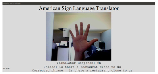 The here presented ASLAT is based on a graphical user interface, which contains a frame showing real-time images captured by the camera, and three lines of text, containing, SLR response of current image, sentence obtained from sign sequence to word converter and the corrected sentence resulted from WSC, respectively, in descending order, as shown in Figure 2. However, these lines were added for testing purposes since a text-to-speech stage will be added in future releases.