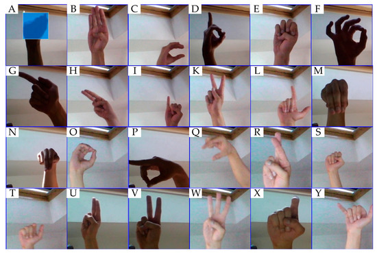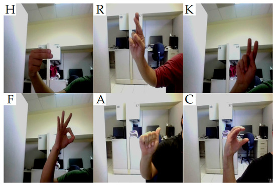 Presented experimental results were obtained using a dataset generated for this specific purpose (not considered for training) (this testing set will be called testset in the rest of this paper). The testset contained 1300 images from five volunteers. The testing dataset consisted of 50 images per sign. All the images were captured with an e-CAM132_TX2 RGB camera (different sensors than training and fine-tuning datasets) and in two different background scenes. A sample of the testset resized to 352 × 352 can be seen in Figure 7.