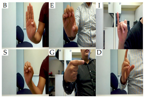 Samples of the signs B, E, I, S, G, and D of the testing dataset.