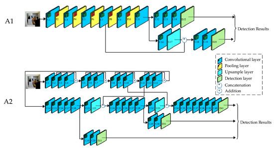 To obtain a real-time ASLAT with high mAP, some experiments were performed to select the proper YOLO network architecture for this specific application. For this purpose, two architectures (called A1 and A2 in the rest of the paper) (Figure 8) were tested and analyzed. The architectures are based on the network YOLOv3-tiny and YOLOv3, respectively [35]. Each architecture was implemented with three different input image sizes to obtain a wider variety of options for selecting the most suitable architecture. The input image sizes are 288 × 288, 352 × 352, and 416 × 416, based on sizes used by authors in [24].
