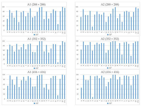 The per-sign average precision (AP) for every architecture is shown in Figure 10, where signs “M” and “N” are the letters with less AP for most of the models due to the similarities with other signs. Other signs, such as “F” and “X”, showed a large discrepancy in some models. This was the consequence of three main factors. Overfitting for some models and signs—under some lighting and hand rotation conditions, these signs could be misinterpreted as other signs, such as “R” and “W” in the case of sign “F”. In addition, since a different camera sensor was used for calculating the AP and raw camera resolutions and aspect ratios were considerably different, during the image rescaling process, signs could be significantly deformed. However, this could be solved by enhancing the training dataset by including images with varying aspect ratios of different camera sensors or by applying data augmentation as in [18].