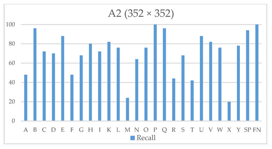 Figure 11 presents the recall of model A2 (352 × 352) for every sign using the 1300 images for testing (testset). This represents how successful the model is to detect presented signs since it depends on the true positives and false negatives. This metric is important to our system since, as previously mentioned, eight consecutive signs must be detected to be issued to the letter sequence to word converter (See Figure 1).