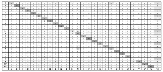 To better understand the performance of A2 (352 × 352), Figure 12 shows a confusion matrix of the selected YOLO model. The confusion matrix was generated with 50 images per sign (testing set). In Figure 12, rows and columns represent target and predictions, respectively; N/D is not detected. As can be seen in the confusion matrix, where false positives (FP) and false negatives (FN) are shown; signs, such as “X”, “M”, and “F” presents the highest FN, as above-mentioned, overfitting, and sign deformation during image rescaling can explain these misclassifications, and signs with the most similarities, such as, “N”, and “T” presents the higher FP.