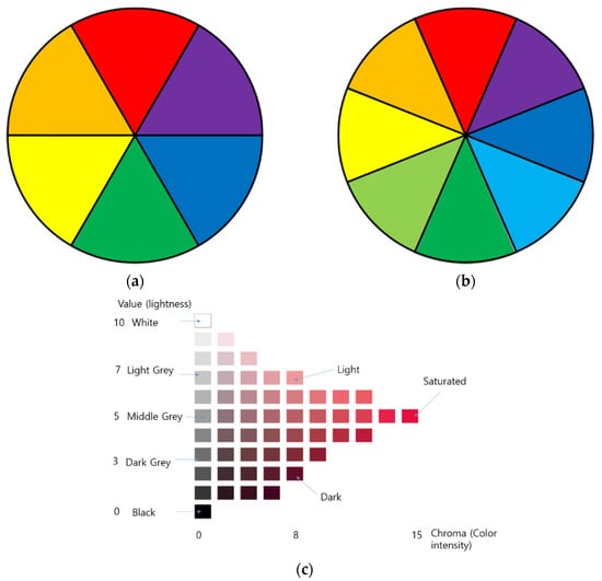 Figure 2 illustrates the RYB color wheel that was created by Johannes Itten []. There are two simplified color wheels that we want to express using 3D sound. One is a 6-color wheel composed of three primary colors (red, yellow, blue) and three secondary colors (orange, green, purple) as shown in Figure 2a, and the other as shown in Figure 2b is an 8-color wheel consisting of 8 colors (red, orange, yellow, yellow-green, green, blue-green, blue, purple). In addition, for each color (hue), three color tones (light, saturated, dark) as shown in Figure 2c are expressed in 3D sound. In addition, three achromatic colors of white, black and gray are expressed in 3D sound.