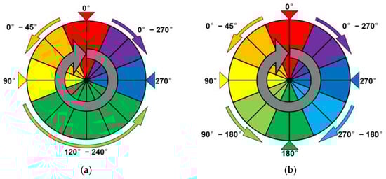 For easy identification of the color code, HRTF is used for the color representation with different fixed azimuth angles (0°, 45°, 90°, 135°, 180°, 225°, 270°, and 315°) to represent each color. However, the difference in the effect of the same HRTF for each person makes it possible to confuse 45°, 135°, 225°, and 315° with the adjacent angles. This effect is not ideal. Therefore, the primary colors are represented by a fixed 3D sound, and the secondary colors are represented by a moving 3D sound to make it easier to recognize how the two primary colors are mixed. The color representation of the six-color wheel codes is shown in Figure 3a and Table 2, and the eight-color wheel codes are shown in Figure 3b and Table 3. The six-color wheel codes are not represented like the six-color wheel in Figure 2a, because the fixed azimuth angles of 120° and 240° are relatively vague and not as accurate as 90° and 270°. Thus, yellow and blue are represented by 90° and 270°, and the range of green is relatively expanded.